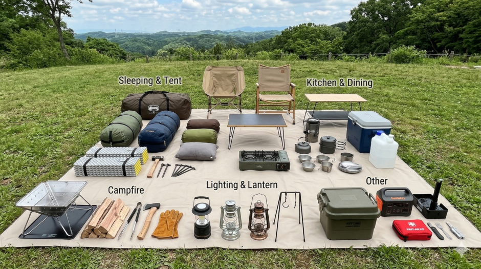 具体的には、寝るための道具(テント、寝袋、マット)、火を起こす・調理する道具(バーナー、クッカー、焚き火台)、明かりを確保する道具(ランタン)が挙げられます。これらを揃えて何度かキャンプを経験するうちに、自分にとって本当に必要なもの、もっと欲しいものが分かってくるでしょう。